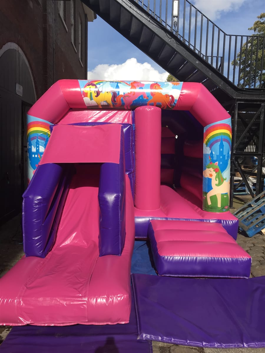 Unicorn Bouncy Castle with attached front slide.