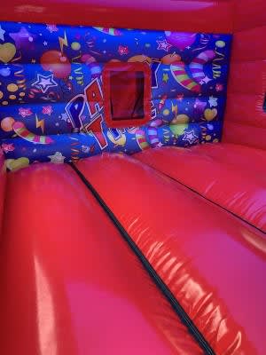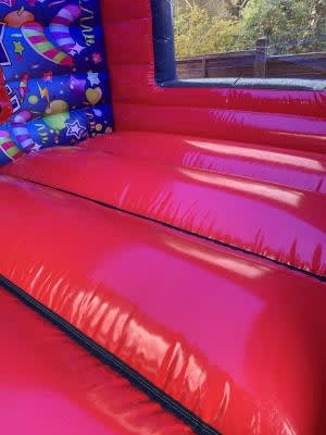 The inflatable features a bright party-themed design with colourful balloons, stars and ribbon graphics, making it suitable for a wide range of events without leaning towards a specific theme. Inside, there is digitally printed celebration artwork and a bold red floor that helps the unit stand out at events in Sidcup and nearby areas.