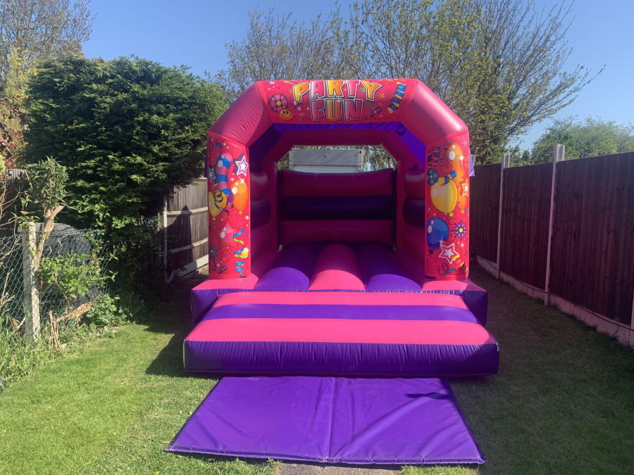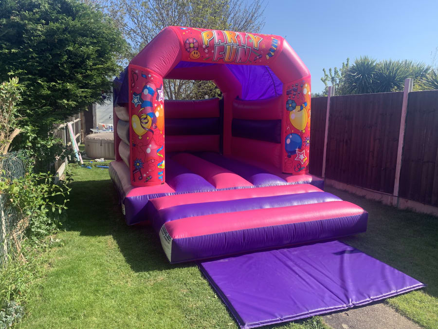 Planning a birthday party then consider this beautiful pink bouncy castle. Supplied with a shower cover and a sunshine cover this bouncy castle will be a great party piece at any girls party. Artwork inludes balloon,s, party streamers and the words party fun looks great against the 2 tone pink castle.